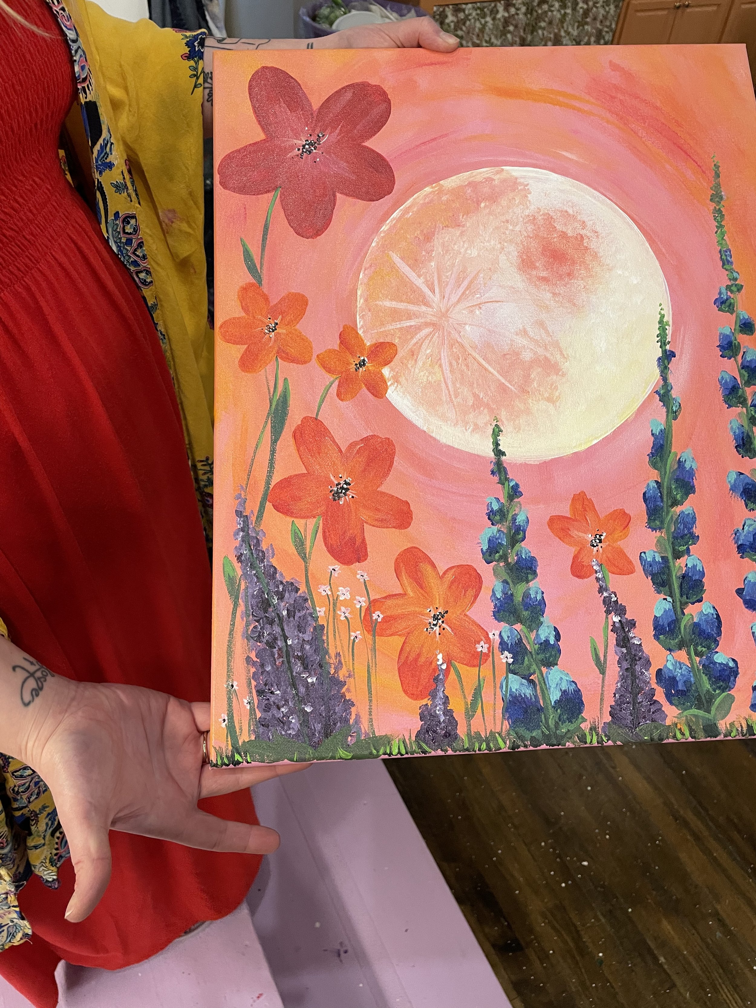 Leah will guide you through Floral Moon on a 16x20 inch canvas.